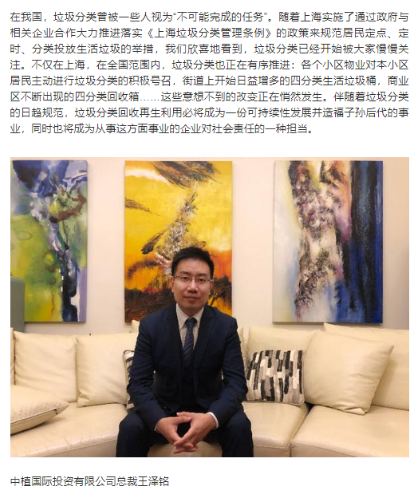 在中植国际投资有限公司总裁王泽铭看来,可回收垃圾处理本身创造了价值,循环经济让资源得到最大限度利用。此外,垃圾分类是全民素质提升的标志,“如果每个人把自己力所能及的事情自控地多做一点,形成的不光是经济价值,文明价值也是巨大的”。