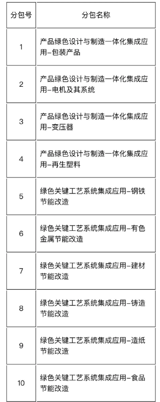 招标内容与范围:本招标项目划分为25个标包,本次招标为其中的:001第1包 产品绿色设计与制造一体化集成应用-包装产品,002第2包 产品绿色设计与制造一体化集成应用-电机及其系统,003第3包 产品绿色设计与制造一体化集成应用-变压器,004第4包 产品绿色设计与制造一体化集成应用-再生塑料,005第5包 绿色关键工艺系统集成应用-钢铁节能改造,006第6包 绿色关键工艺系统集成应用-有色金属节能改造,007第7包 绿色关键工艺系统集成应用-建材节能改造,008第8包 绿色关键工艺系统集成应用-铸造节能改造,009第9包绿色关键工艺系统集成应用-造纸节能改造,010第10包 绿色关键工艺系统集成应用-食品节能改造,011第11包 先进适用环保装备系统集成应用-大气治理及低碳装备,012第12包 先进适用环保装备系统集成应用-污水治理装备,013第13包 先进适用环保装备系统集成应用-环境监测仪器,014第14包 先进适用环保装备系统集成应用-农村环保装备,015第15包 水资源优化系统集成应用-节水与水处理装备,016第16包 水资源优化系统集成应用-污水资源化利用,017第17包 水资源优化系统集成应用-园区水资源系统优化,018第18包 终端产品资源化利用系统集成-退役动力蓄电池回收利用,019第19包 终端产品资源化利用系统集成-高值废旧产品回收利用,020第20包 终端产品资源化利用系统集成-工业固体废物资源化利用,021第21包 终端产品资源化利用系统集成-机电产品高端智能再制造,022第22包 数字化绿色提升集成应用-工厂数字化绿色提升,023第23包 数字化绿色提升集成应用-绿色数据中心和基站建设,024第24、25包 行业绿色发展基础能力提升-全工业领域(一)~(二)。