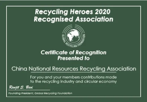 2020年4月22日,中国物资再生协会荣获国际回收基金会(Gobal recycling foundation)颁发的“回收英雄2020认证组织”证书。