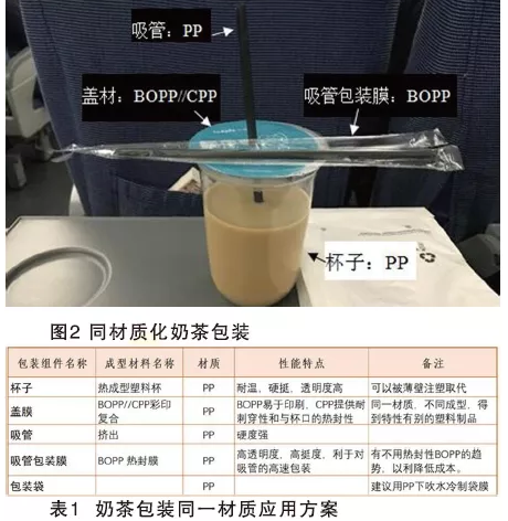 塑料同材质化即在同一产品上所用塑料制品均使用单一的化学组分相同而物理性质可不同的树脂材料。如图2,上海虹桥高铁站某奶茶的包装,杯材采用PP吸塑拉伸成型,盖材采用BOPP//CPP复合材料,吸管是PP,吸管包装膜用BOPP,在整个产品包装上做到同材质化,易于回收。