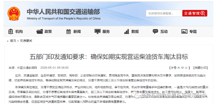 近日,交通运输部、生态环境部、财政部、商务部、公安部联合印发通知,贯彻落实党中央、国务院决策部署和相关文件要求,加快推进柴油货车污染治理,切实降低柴油货车污染,确保如期实现京津冀及周边地区、汾渭平原淘汰国三及以下排放标准营运柴油货车的目标。