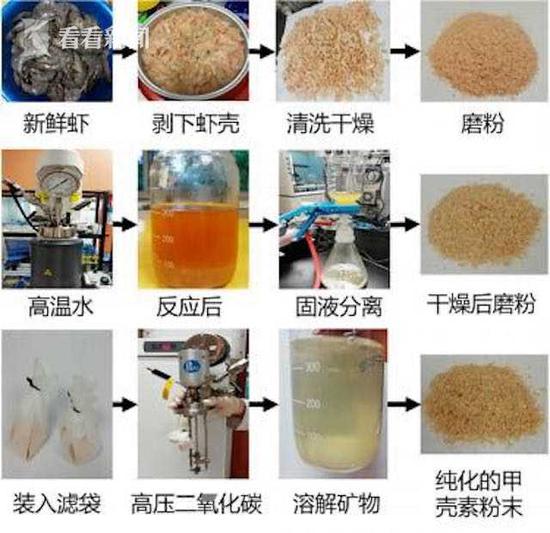 上海交大中英国际低碳学院陈熙课题组和新加坡国立大学颜宁课题组合作,成功开创了一种温和无污染的新技术来处理虾蟹壳垃圾。新技术采用高压二氧化碳为一种绿色酸试剂,在水中溶解虾蟹壳中的碳酸钙,去除率达到95%以上。对于蛋白质的去除,类似煮肉汤的过程,通过180度高温水使蛋白质水解脱落,整个过程只使用了二氧化碳和水两种试剂,几乎没有污染物产生,且成本低廉,两步处理后甲壳素的纯度可达90%以上。通过成分和碳排放计算,这项新技术比传统工艺能够减少碳排量80%,总体成本也为传统工艺的约一半。