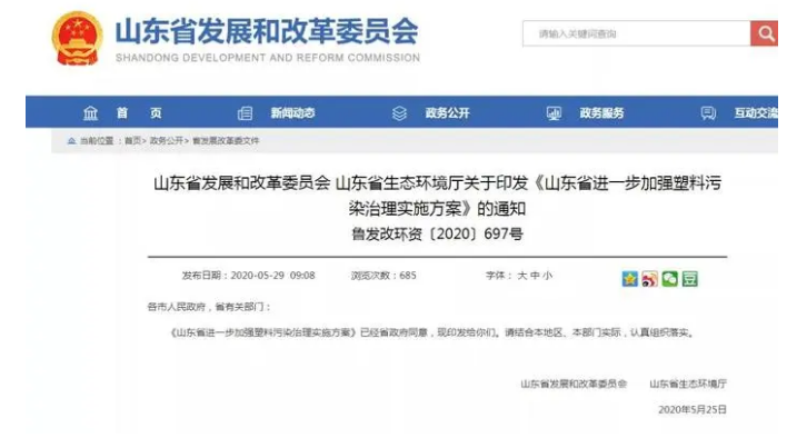 5月29日,山东省发展和改革委员会、山东省生态环境厅发布《山东省进一步加强塑料污染治理实施方案》(以下简称《方案》),为该省全面加强塑料污染治理制定了"时间表"。