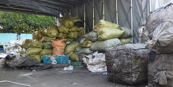“塑料区”内堆放了用发黑发臭的编织袋打包的整袋整袋废旧塑料,堆得小山一样高。“纸板区”内的叉车正将压缩后的整捆整捆废纸运送到重型卡车上。“木材区”内两辆大型卡车正满载整装待发,现场空地上仍杂乱堆放了数米高的废旧家具和木材,存在消防隐患。