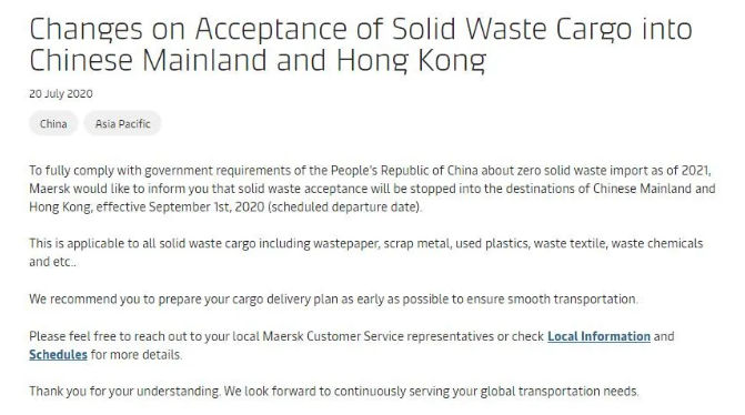 7月20日,马士基发布公告称,为满足中国对固体废物的进口要求,马士基从2020年9月1日(计划离港时间)起,将停止接收运至中国内地和香港的固体废物类货物。