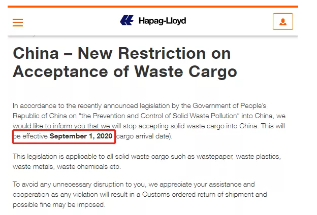 此前,赫伯罗特发布公告通知客户,将于2020年9月1日(货物到达日期)将不再接受运往中国的包括废铁在内的固体废物,适用于所有固体废物货物,如废纸、废塑料、废金属、废化学品等。以遵守新法规。(详情查看文章:最高罚款500万元!船公司禁运该类货物,承担连带责任)