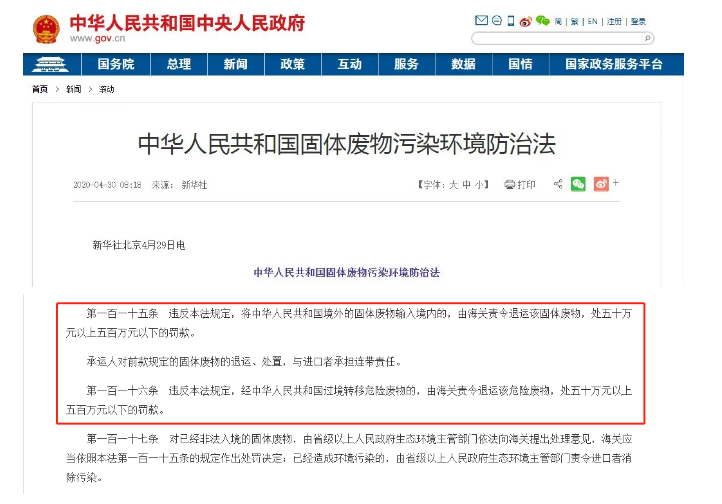 今年,全国人大常委会修订通过了《固体废物污染环境防治法》,该防治法明确了进口固体废物至我国,或经由我国转移危险废物的,将处50万元以上500万元以下的罚款。《固体废物污染环境防治法》将于2020年9月1日起施行。