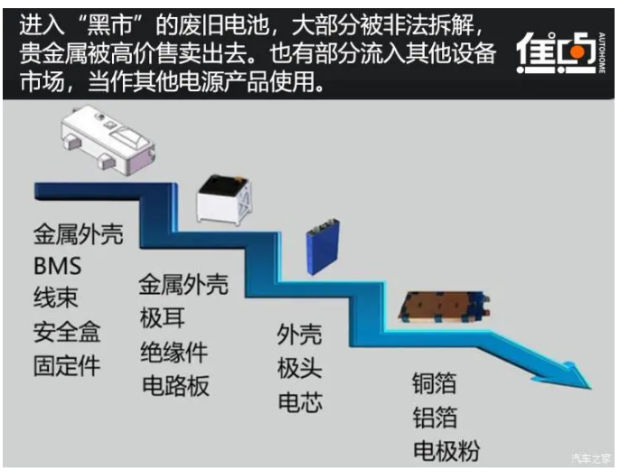 吴钊对电池回收行业进行过深入研究。他向汽车之家表示,“黑市”小作坊对电池回收处理有两种途径:一是将钴、锂等贵金属提炼出来直接出售,获得高额的贵金属销售收入;二是电池回收后,将其售卖给低速电动车、电动自行车等梯次利用领域。
