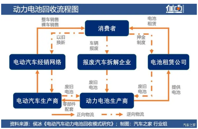 动力电池回收之所以面临困境,与其漫长的回收链条不无关系。按照电池回收流程,动力电池从电池生产商通过经销商网络、租赁网络正向流转到消费者。之后,动力电池再由消费者,逆向流转至经销商网络、报废拆解企业以及电池租赁公司,再通过检测、筛选、拆解等手段,进入梯次利用领域,或者最终报废回收。