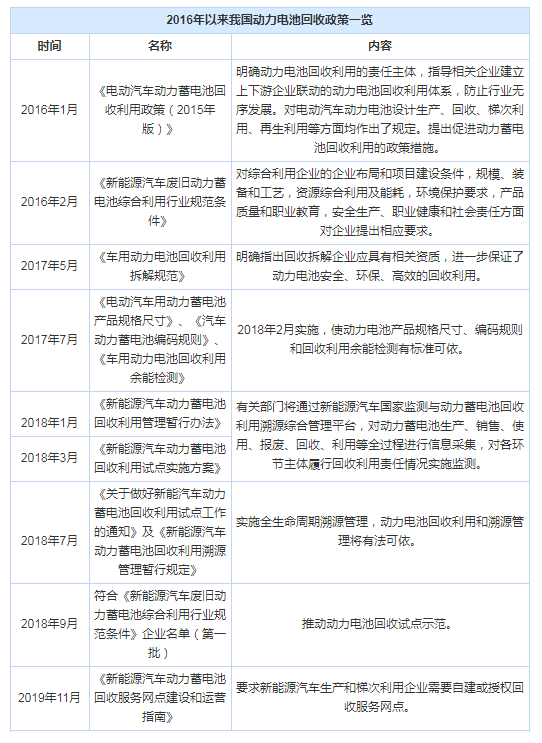 2018年7月底,工信部就公布首批符合《新能源汽车废旧动力蓄电池综合利用行业规范条件》(简称《规范条件》)企业名单。2020年1月,工信部发布《规范条件(2019年本)》,对动力电池回收企业申报条件提出更多的要求。未来,会有更多符合电池回收条件的“白名单”企业。