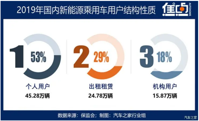 再看新能源乘用车都卖给了谁?以2019年数据为例,汽车之家了解到,个体用户、出租租赁、机构用户是新能源乘用车采购的三大“金主”。