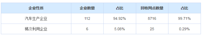 汽车之家统计出工信部公布的动力电池回收网点情况,截至2020年5月,全国共有回收服务网点8741个,其中涉及整车企业112家,梯次利用企业6家。从网点分布情况来看,车企建立的回收网点占据绝大部分数量,在全国各地均有覆盖。从具体网点来看,以汽车企业4S店网络为主,也有少部分与车企合作的报废拆解企业建立的网点,以及梯次利用企业建立的网点。