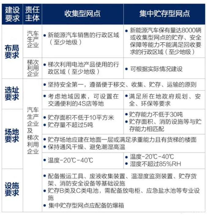 电池回收网点分为收集型网点和集中贮存型网点。这两类网点分工也不难理解,收集型网点是收集、暂存废旧动力电池的场地,主要用于存放从车主手中回收到的动力电池;集中贮存型网点,则是大批量储存报废车辆或者废旧动力电池的场地,用于中转、集中储运回收上来的动力电池。