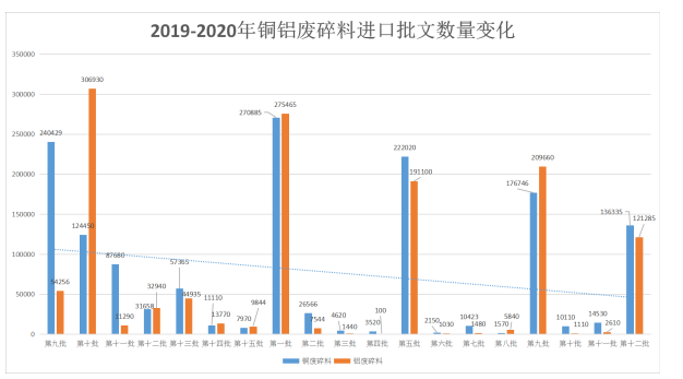 第三季度(第九批至第十二批)铜废碎料批文总量337721吨,铝废碎料批文总量334665吨。