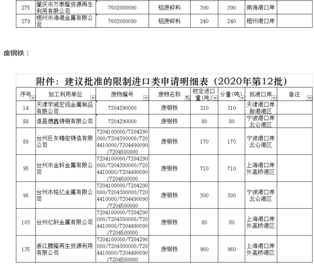 第十二批全国废金属进口批文总量为260230吨,其中铜废碎料136335吨,铝废碎料121285吨,废钢铁2610吨。