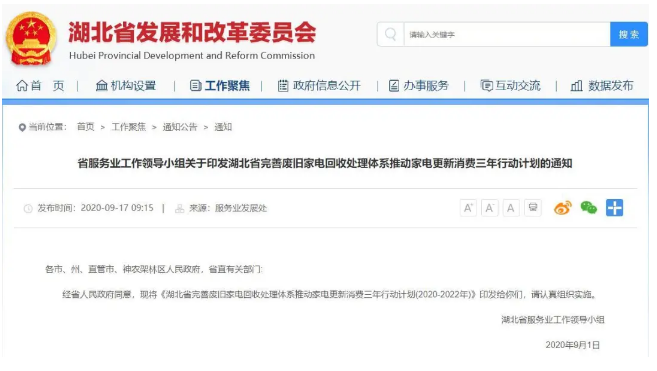 湖北省近日印发《湖北省完善废旧家电回收处理体系推动家电更新消费三年行动计划(2020-2022年)》(以下简称《三年计划》),到2022年我省将基本建成规范有序、协同高效的废旧家电回收处理体系,废旧家电规范回收率达50%以上。