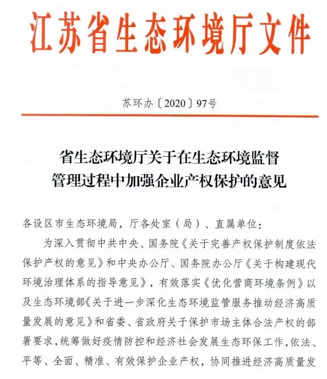 近日江苏省生态环境厅出台《关于在生态环境监督管理过程中加强企业产权保护的意见》,通过对守法企业无事不扰,标杆企业豁免, 严禁环保“一刀切”,保护企业产权。