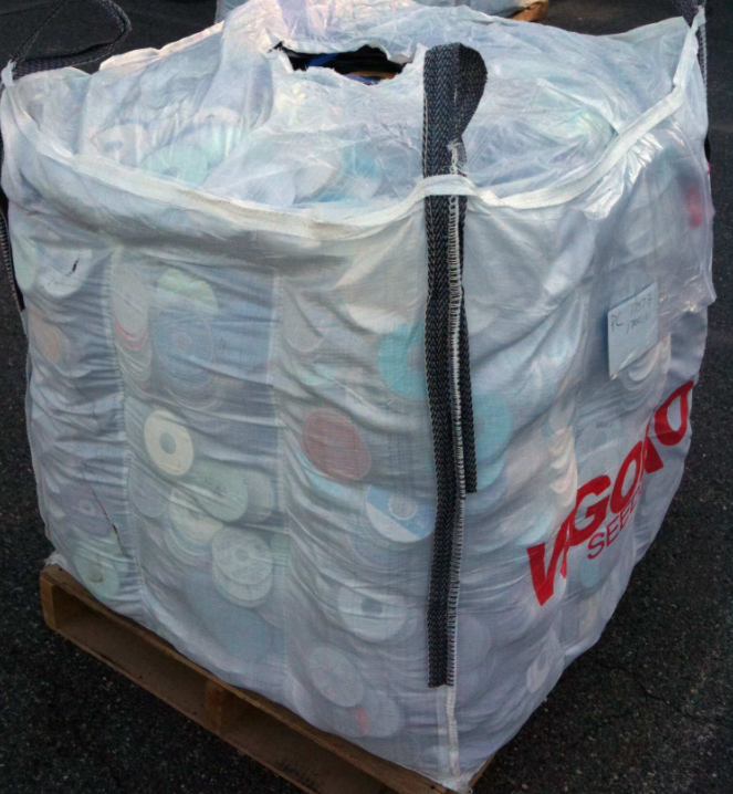 在新罕布什尔州塞勒姆的CD回收中心,一袋袋的CD在托盘上等待回收