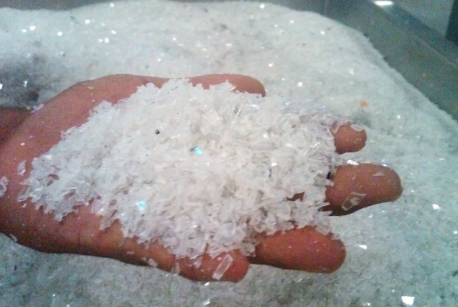 55岁的Bennett需要在仓库里储存一卡车(约44000磅)重的CD,然后把CD制成原始的聚碳酸酯塑料颗粒,形成一种白色透明的粉状物质,闪闪发光,就像粘在一起的大雪花晶体。