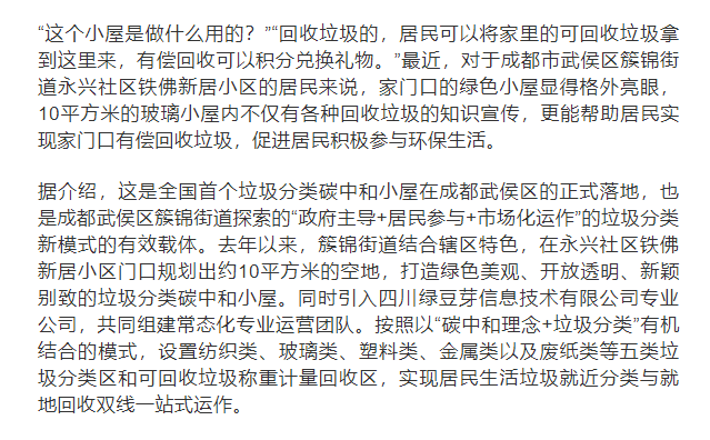 央广网成都2月2日消息(记者韩民权)记者2日从成都市武侯区委宣传部获悉,全国首个垃圾分类碳中和小屋在成都武侯区的正式落地,实现可回收垃圾“线下称重——线上换算——立即到账”快捷化、快速化的有偿回收。