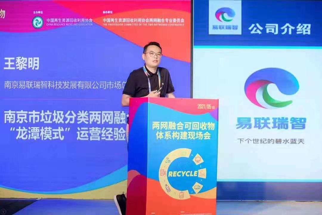 南京易联瑞智科技发展有限公司市场总监王黎明围绕“龙潭模式”分享了南京市垃圾分类两网融合运营经验。他讲到,该模式以龙潭转运中心为载体和圆点,向整个龙潭街道覆盖四分类清运网络,后针对网络中的各类型主体采用不同的分类投放和收集模式,推动了龙潭垃圾分类全覆盖进程。