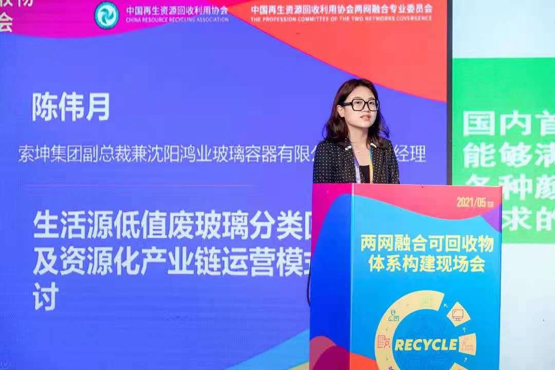 索坤集团副总裁兼沈阳鸿业玻璃容器有限公司执行总经理陈伟月就“生活源低值废玻璃分类回收及资源化产业链运营模式”进行了交流。据介绍,该公司60-90%以上的生产原料来自社会回收废旧玻璃,既做到了废物循环再利用,又可以降低玻璃熔化过程中的燃料消耗,减少污染物排放。