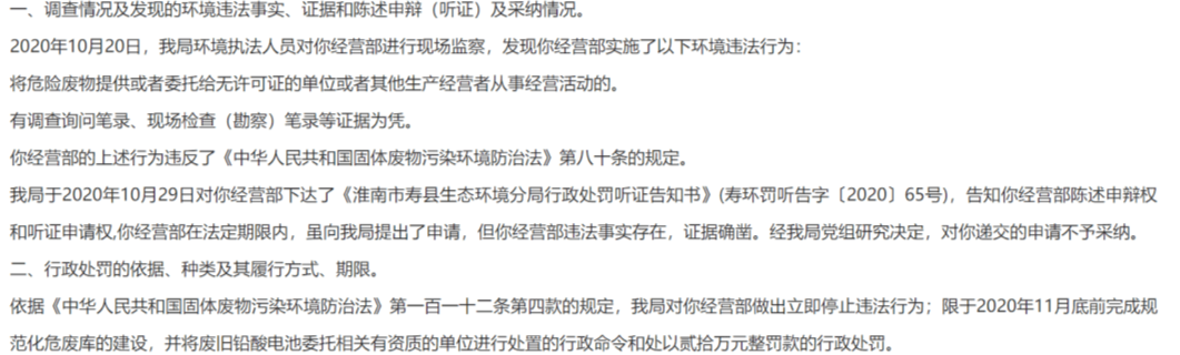 行政处罚决定书显示,2020年10月20日,环境监察人员对当地一家电动车经营部危险废物铅酸蓄电池收贮及处置情况进行现场监察时,发现该门店无许可证从事收集、贮存、利用、处置危险废物经营活动。