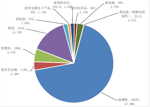 图 1 2019年我国主要品种再生资源回收量及占比情况