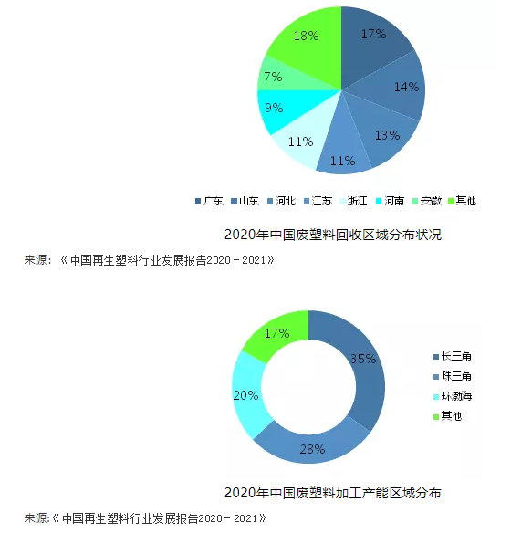 我国的废塑料再生加工企业的分布受原有海外进口废塑料加工的因素和产废集中度的影响非常大,多分布在长三角、珠三角、京津冀等邻近港口且经济发达、人口密度大的地区,长江沿岸地区以及中部城市群也有一定的产能分布。这类地区塑料消费总量巨大、产废集中,而且交通便利,回收再生企业在此布局有明显的成本优势。
