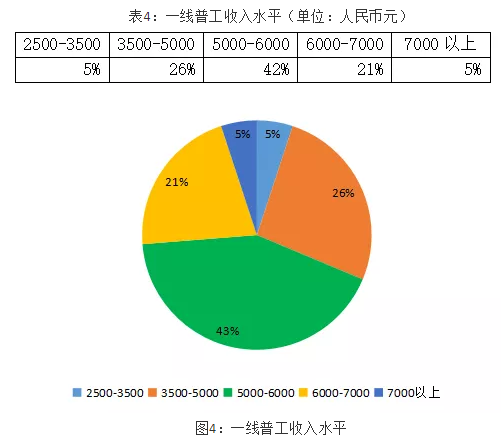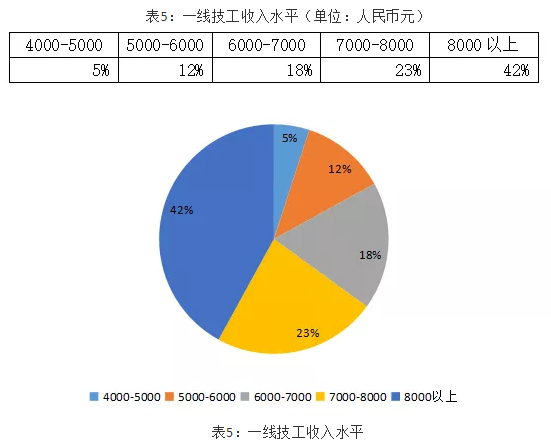 一线技术工人薪资水平明显高于一线普工,约42%的企业提供给一线技工的薪资超过了8000元。
