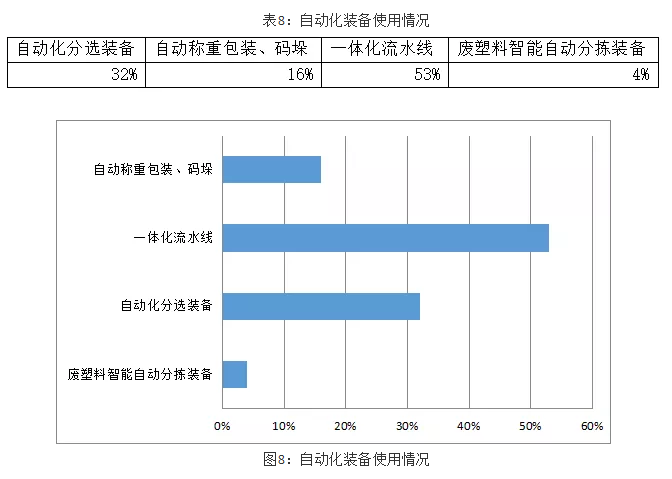 在装备方面,有约53%的企业使用了一体化流水线,分选装备的使用率接近三分之一,但前端废塑料智能分拣装备的应该程度相常底,多数打包站、废塑料分拣中心依然采用了人工分拣的方式。