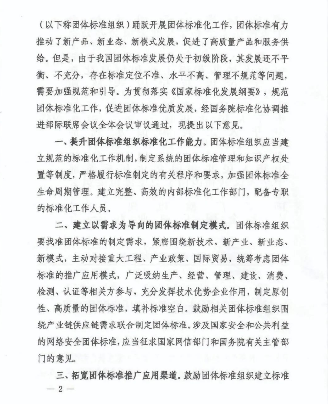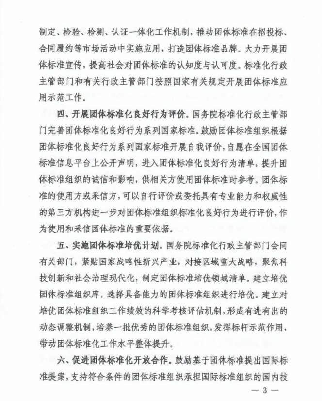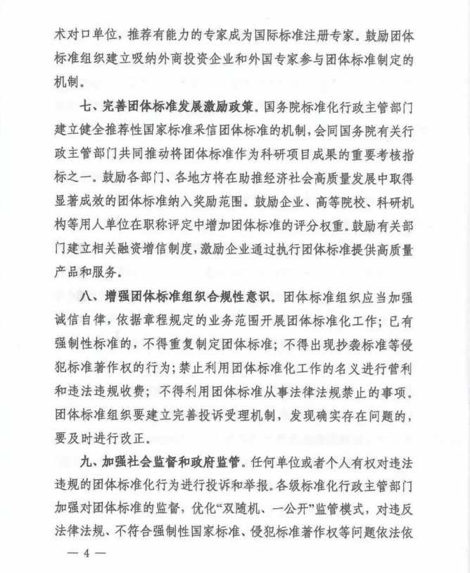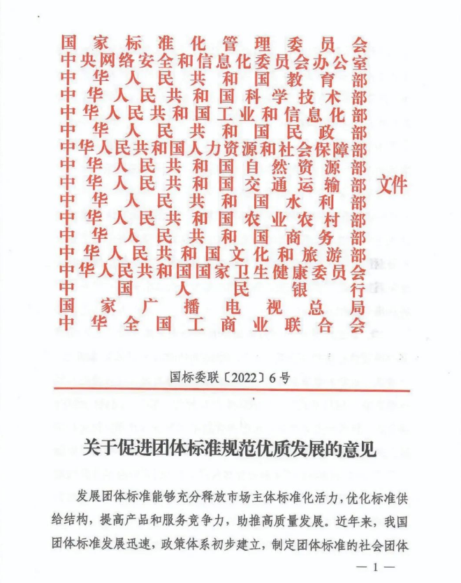 近日,国家标准化管理委员会等17部门联合发布了《关于促进团体标准规范优质发展的意见》的通知。分别从提升团体标准组织标准化工作能力、建立以需求为导向的团体标准制定模式、拓宽团体标准推广应用渠道、开展团体标准化良好行为评价、实施团体标准培优计划、促进团体标准化开放合作、完善团体标准发展激励政策、增强团体标准组织合规性意识、加强社会监督和政府监管等方面给出了指导意见。其中,在完善团体标准发展激励政策中特别提到,建立健全推荐性国家标准采信团体标准的机制,会同国务院有关行政主管部门共同推动将团体标准作为科研项目成果的重要考核指标之一。鼓励各部门、各地方将在助推经济社会高质量发展中取得显著成效的团体标准纳入奖励范围。鼓励企业、高等院校、科研机构等用人单位在职称评定中增加团体标准的评分权重。鼓励有关部门建立相关融资增信制度,激励企业通过执行团体标准提供高质量产品和服务。