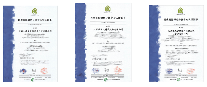 以上分别为再生资源绿色分拣中心刚刚认证编号分别为CSCA22G0001R0L、CSCA22G0002R0S和CSCA22G0003R0S的中再生徐州资源再生开发有限公司、江苏荣运达科技股份有限公司和天津拾起卖循环产业供应链管理有限公司。