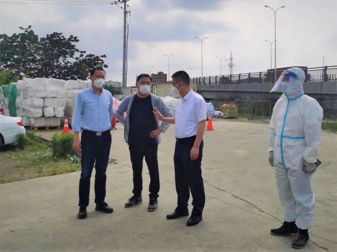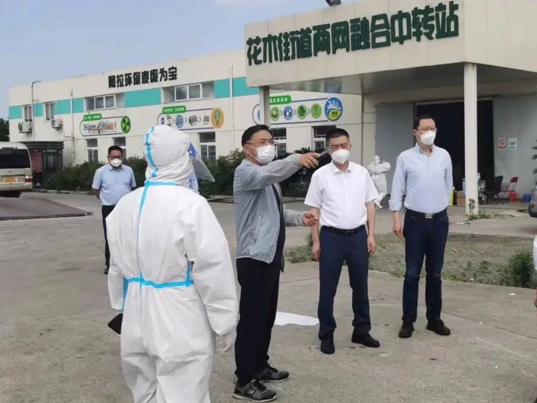 5月25日,浦东新区生态环境局党组书记、局长康永良、副局长薛加良以及相关处室领导一行赴花木街道可回收物中转站现场调研指导检查疫情防控及“阿拉环保”可回收物托底清运运行情况。