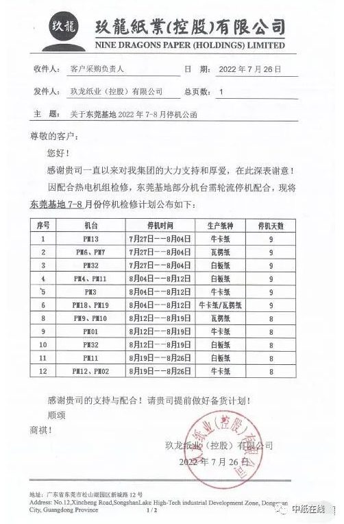 根据计划,东莞玖龙的纸机将分批次停机。
