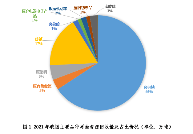 2021年是“十四五”的开局之年,面对复杂严峻的国际环境和国内疫情散发等多重考验,我国坚持稳中求进工作总基调,科学统筹疫情防控和经济社会发展,国民经济持续恢复发展。再生资源回收行业在政府相关部门的关注和政策的扶持下,回收体系不断完善,再生资源回收总量和回收总值呈现上升趋势。截至2021年底,我国废钢铁、废有色金属、废塑料、废纸、废轮胎、废弃电器电子产品、报废机动车、废旧纺织品、废玻璃、废电池(铅酸电池除外)十个品种再生资源回收总量约为3.81亿吨,同比增长2.4%,其中废塑料、废纸、报废机动车、废旧纺织品、废电池(铅酸电池除外)的增长量均超过了10%。2021年我国主要品种再生资源回收量及占比情况如图1所示