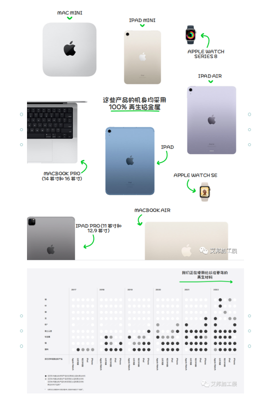 iPad Air (第五代)、Apple Watch Series 8、Apple Watch SE (第二代)和 MacBookAir (M2 芯片机型)的机身均采用100%再生铝;
