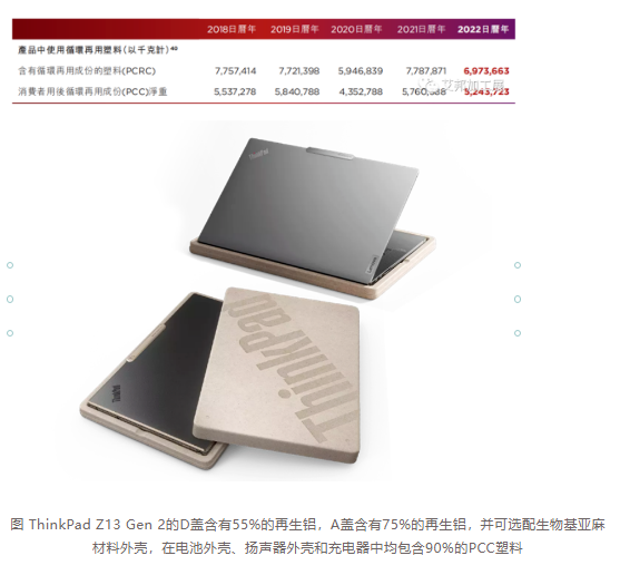 上一财年以来,联想扩大了包含CL PCC和PCC塑料的部件类型,并增加了再生铝、再生镁和趋海塑料(OBP)的使用;