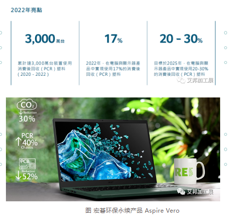 宏碁目标,2023年电脑与显示器使用18.5%消费后回收塑料;2025年消费后回收塑料的使用量达到总塑料使用量的20至30%;2025年个人计算机产品平均能源消耗降低45%。