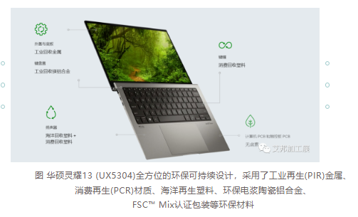 此外,2022 年华硕开始尝试采取更多元化的环境友善材料,例如在以轻薄设计为主要要求的商务笔记本电脑 ExpertBook B9 金属外壳中使用 30% 工业回收金属;家用笔记本电脑 UX5304 使用海废塑料,配件产品则有全外壳均采用由蓖麻油制作而成的生物基质树脂的 ROG 电竞鼠标等。