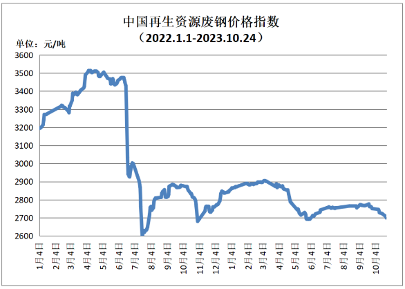 今日中国再生资源废钢价格指数为2699元/吨,与上一个工作日相比下跌7元/吨。今废钢市场稳中有跌。其中华南地区冲花料日加权平均价格为2488元/吨,较上一工作日加权平均价格下跌11元/吨,期螺偏强震荡,一定程度上对废钢铁市场形成支撑,整体来看,部分钢厂废钢到货量略有增多,部分场地压价收货意愿偏强。