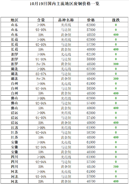 废铜:今日中国再生资源废铜价格指数61991元/吨,较昨日持平。10月19日,国内现货铜成交区间66540-66560元/吨,较上一交易日价跌215元/吨,持货商升贴水对11月b60-b80,升水均值较上一交易日跌15元/吨。上午北方临沂、保定和佛山货场废铜最高报价清光-合股采购价在62300-62400元/吨,午间盘中价格较上午下调100元/吨,主要以现款寄存交易,电解铜价格因需求有所好转维持小升水,但是市场行情涨跌预期存在分歧,升水成交表现一般。废铜抗跌性仍强,精废价差618元/吨价差,位于合理价差下方,不利于再生交易。由于盘中价格小幅上涨后再度回调,价格位于支撑位附近,市场参与者对于当前价位的波动十分敏感,午间部分贸易商急于出手废铜,高价成交情况尚可。预计短期废铜价格维持小区间调整,替代性弱利好精铜消费。