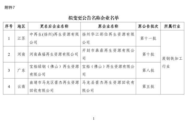 按照《废钢铁加工行业准入条件》等规范条件及相关公告管理办法要求,现将拟公告的符合《废钢铁加工行业准入条件》企业名单(第十三批)、符合《废铜铝加工利用行业规范条件》企业名单(第二批)、符合《废纸加工行业规范条件》企业名单(第四批)、符合《废塑料综合利用行业规范条件》企业名单(第九批)、符合《废旧轮胎综合利用行业规范条件》企业名单(第六批)、符合《机电产品再制造行业规范条件》企业名单(第二批),以及拟变更公告名称、变更公告加工能力和撤销公告的企业名单予以公示。如有异议,请在公示期内将书面意见反馈至工业和信息化部节能与综合利用司。