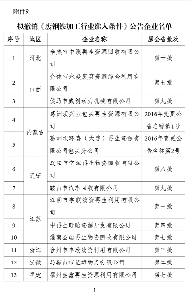 9. 拟撤销《废钢铁加工行业准入条件》公告企业名单