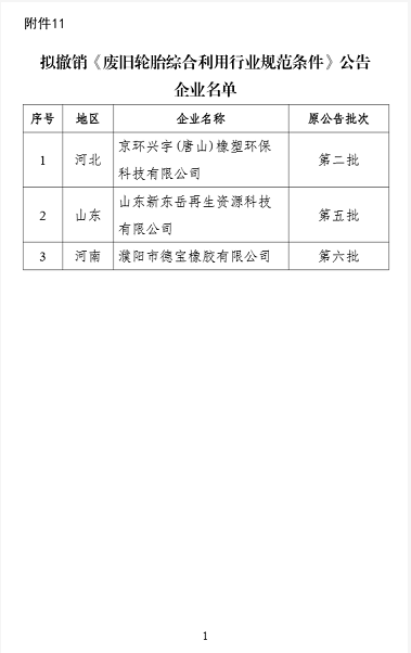 11. 拟撤销《废旧轮胎综合利用行业规范条件》公告企业名单