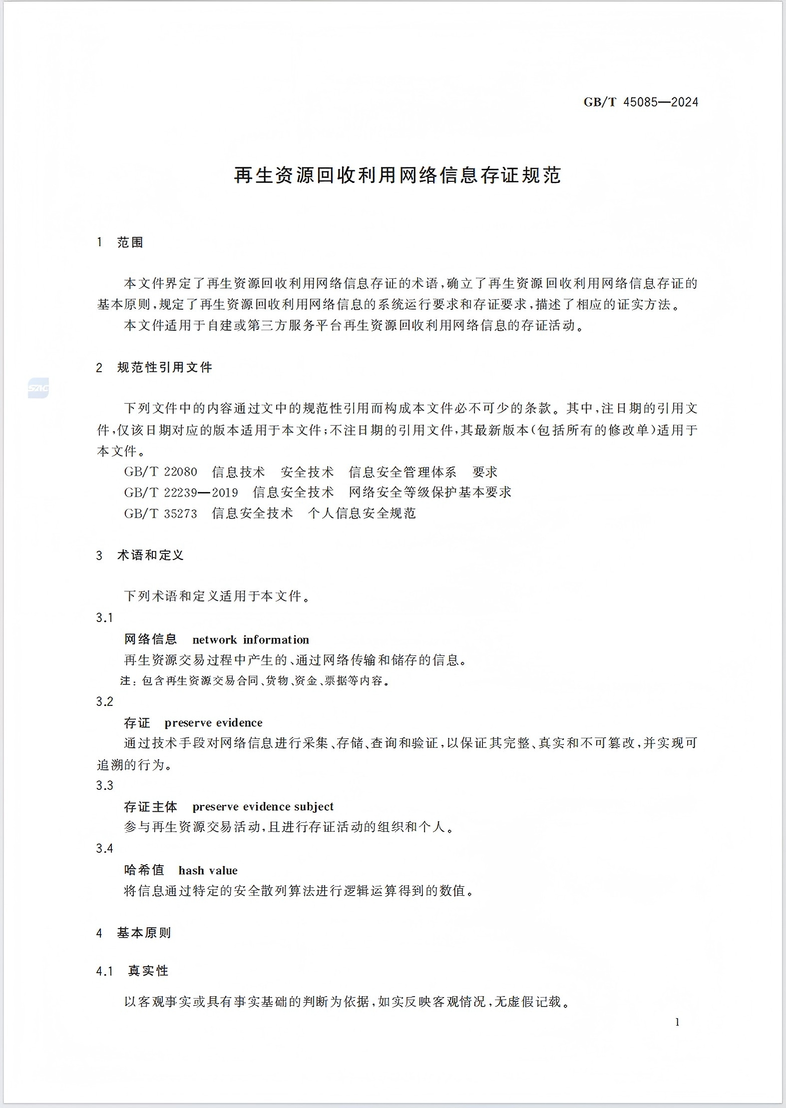 再生资源回收利用网络信息存证规范 GB/T45085—2024