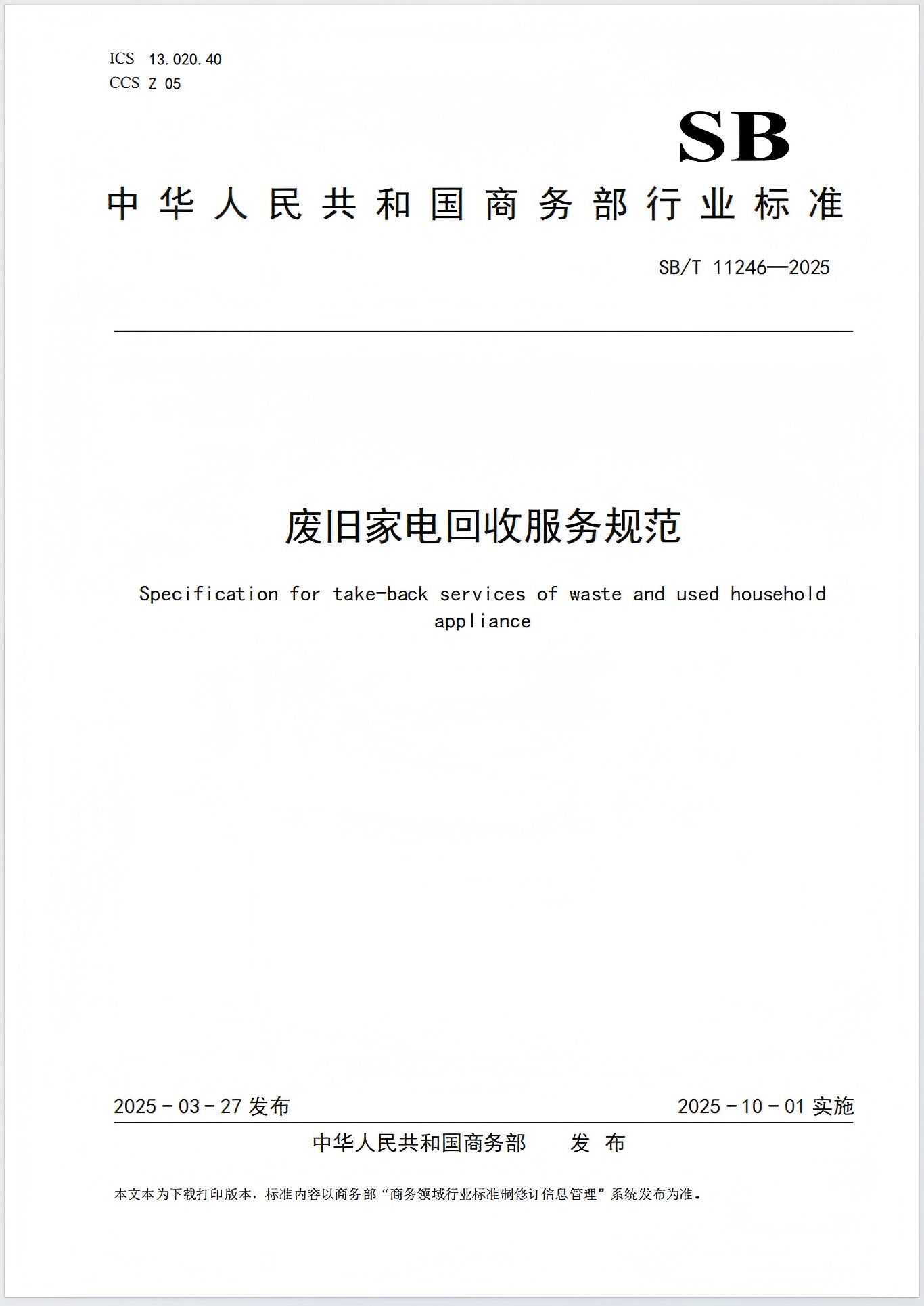 废旧家电回收服务规范 SB/T 11246—2025