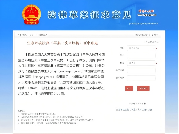 十四届全国人大常委会第十九次会议对《中华人民共和国生态环境法典(草案三次审议稿)》进行了审议。现将《中华人民共和国生态环境法典(草案三次审议稿)》公布,社会公众可以直接登录中国人大网(www.npc.gov.cn)或国家法律法规数据库(flk.npc.gov.cn)提出意见,也可以将意见寄送全国人大常委会法制工作委员会(北京市西城区前门西大街1号,邮编:100805。信封上请注明生态环境法典草案三次审议稿征求意见)。征求意见期限为30日。